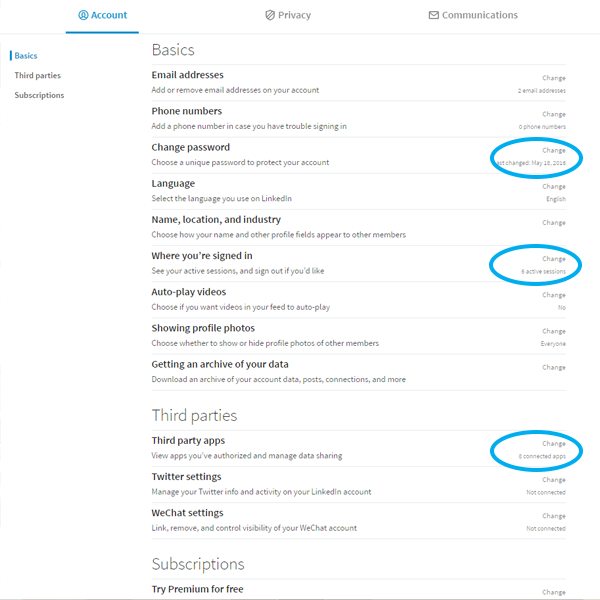 To opt out of sharing basic profile and contact information with third party applications and “trusted third party platforms” select no for both choices under sharing data with third parties. To enable two-step verification, you will need to provide a phone number. Turning this feature on will sign you out of all active LinkedIn sessions.